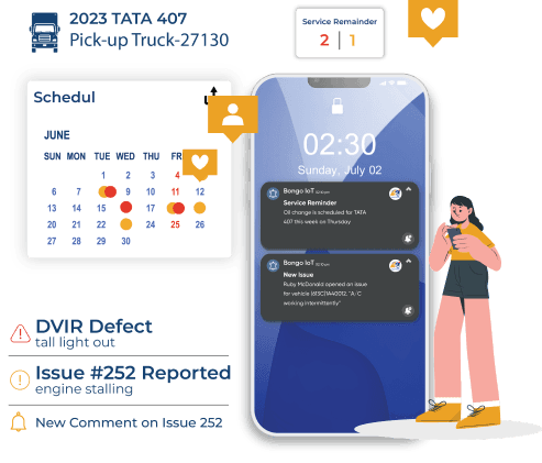Leverage digital inspections (DVIRs) through the Bongo IoT Driver app and automatically get notified of issues when inspection items fail.